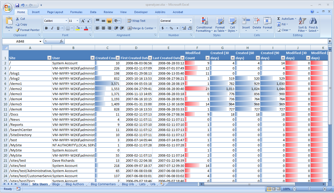 In this project, I created a tool that analyzes a SharePoint 2007 installation and creates a detailed usage report. This tool reports items that are created, modified and viewed with various time horizons and aggregates them by Site Collection, Site, List, User and even URL.