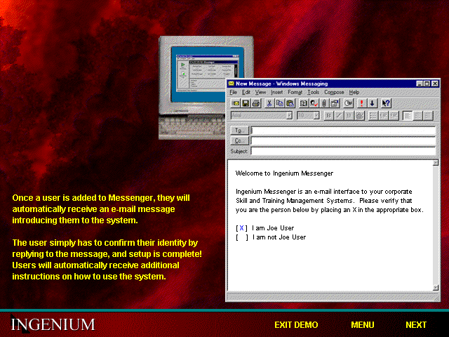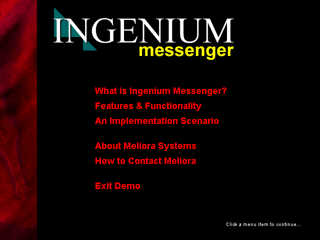 In the Fall of 1996, I produced a Macromedia Director 4.0 demonstration to introduce clients to the Ingenium Messenger product. The demonstration included simulated usage scenarios and incorporated a music soundtrack from a local artist.