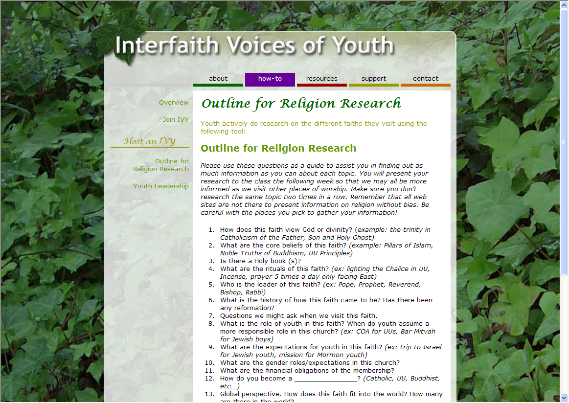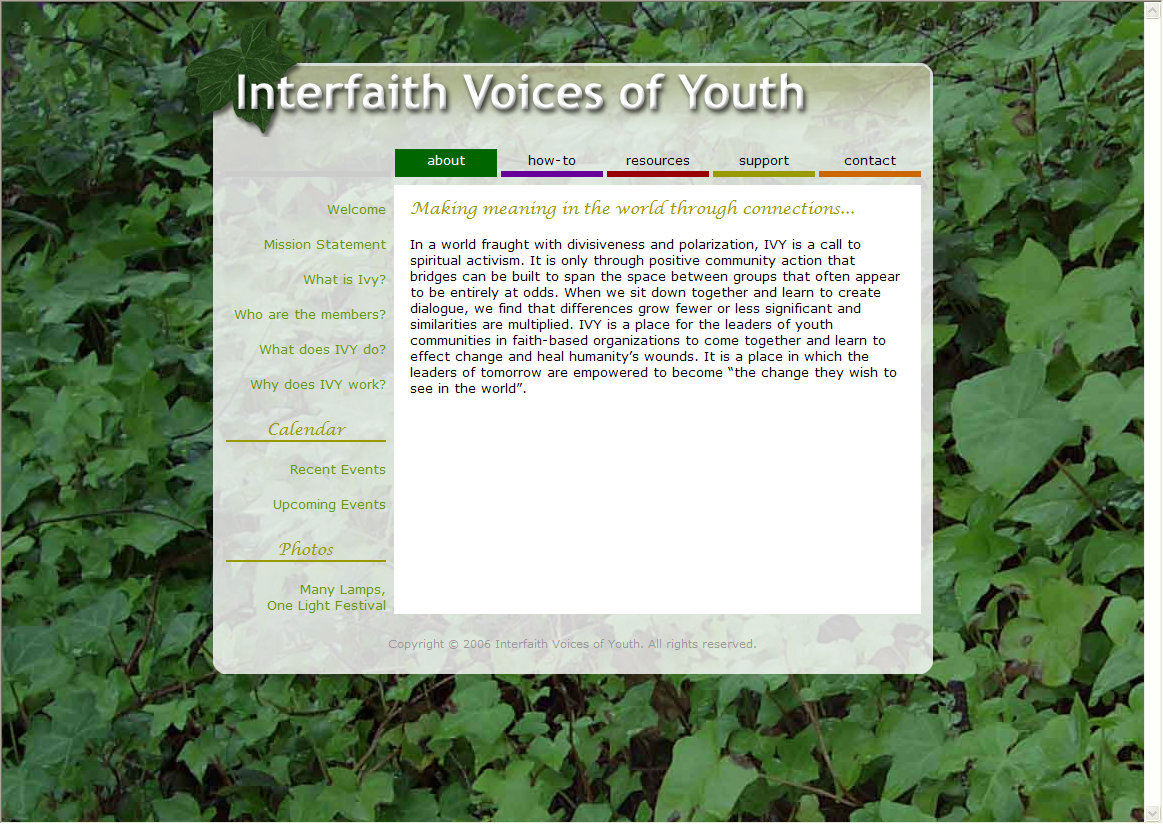 In 2005, I began volunteering as an Adult Facilitator with a non-profit organization in Bellevue, WA named “Interfaith Voices of Youth” (http://www.interfaithvoicesofyouth.org/). This group provides a safe environment for youth from many faiths to gather, learn about different cultures and work together on social justice projects.