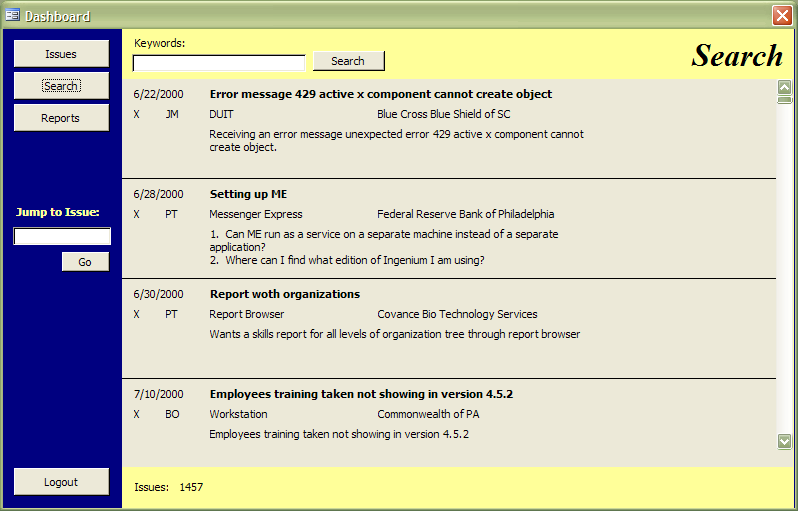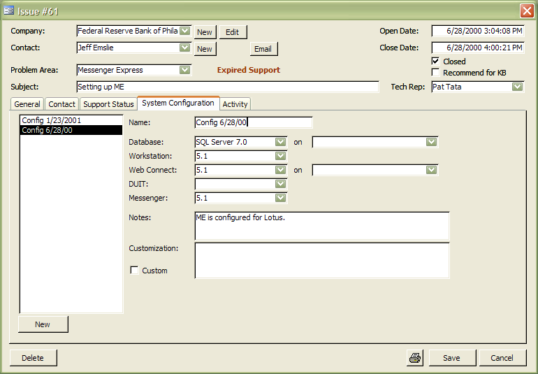 In 2000, I implemented a call-tracking database for our Technical Support team. This database allowed support representatives to more accurately track customer’s configurations, manage the status of interactions, submit findings to the knowledge base and integrate with the finance department.
