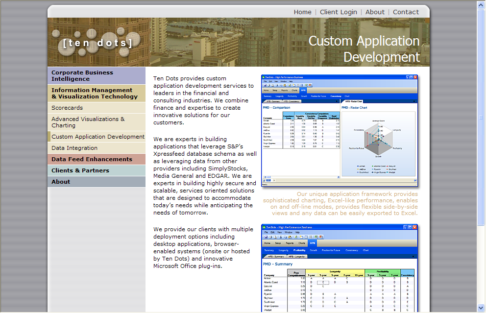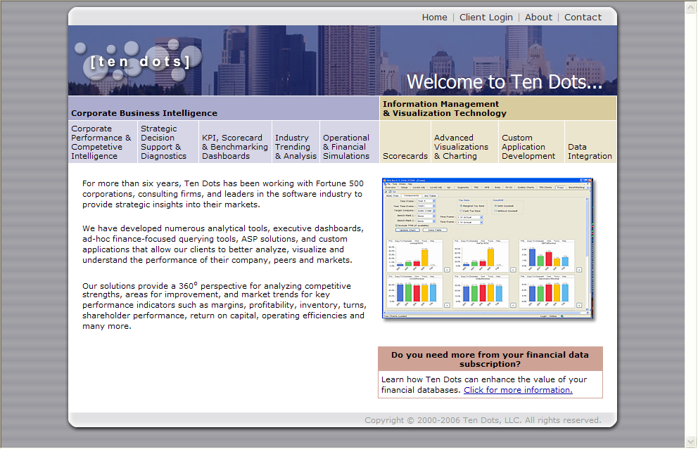 In 2006, I briefly considered pursuing a business partnership opportunity with an existing company that develops high-end financial software. The company was named TenDots (http://www.tendots.com). During that time, I redesigned and implemented their website to reflect current and future products.